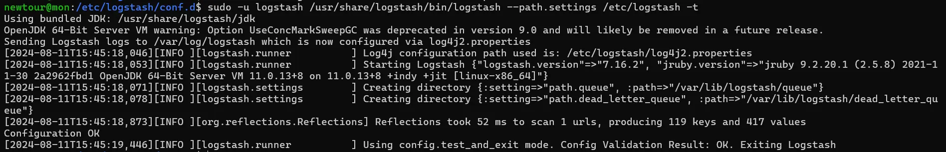 sudo -u logstash /usr/share/logstash/bin/logstash --path.settings /etc/logstash -t