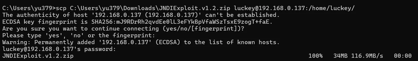 scp C:\Users\yu379\Downloads\JNDIExploit.v1.2.zip luckey@192.168.0.137:/home/luckey/