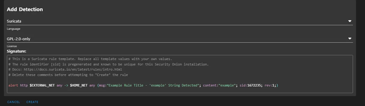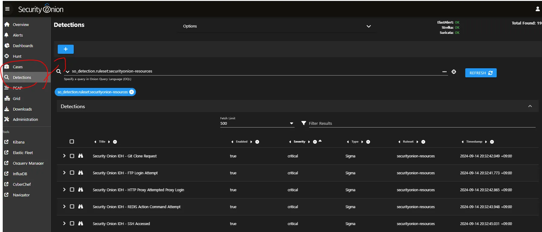 Detection 메뉴 이동 및 “+”버튼 클릭, 룰 추가 메뉴 진입