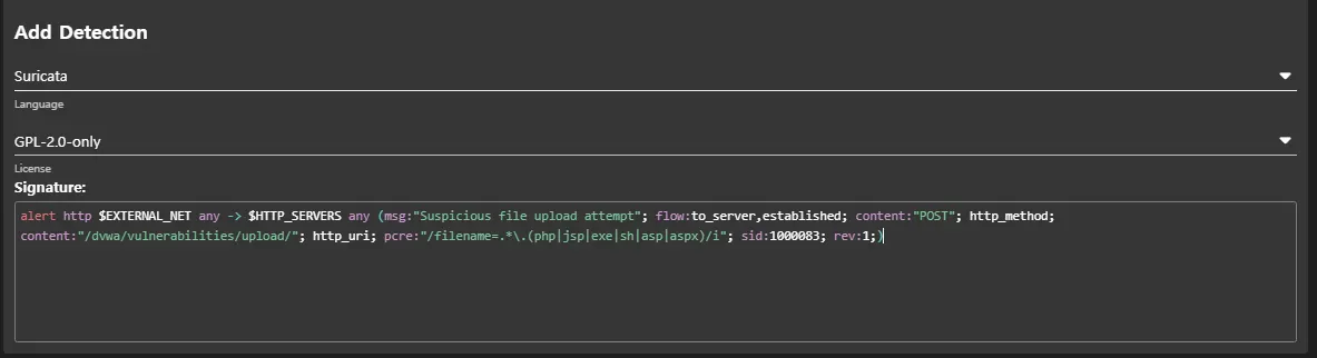 pcre: /filename=.*\.(php|jsp|exe|sh|asp|aspx)/i – 확장자가 .php, .jsp, .exe, .sh, .asp, .aspx인 파일을 감지.