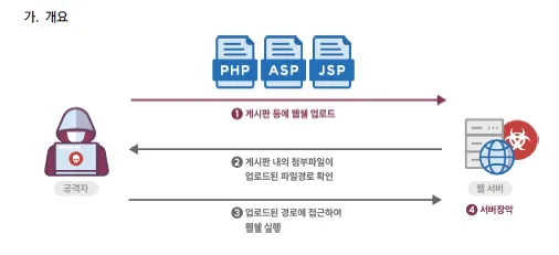 이를 방지하기 위해서는 파일 확장자 및 내용 검증, 업로드된 파일의 실행 권한 제한, 파일명 및 경로 검사를 철저히 해야 합니다.