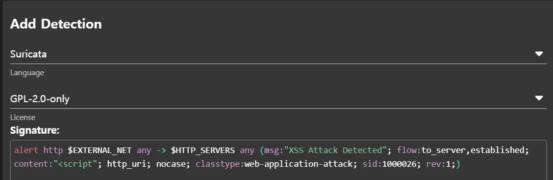 alert http $EXTERNAL_NET any -> $HTTP_SERVERS any (msg:"XSS Attack Detected"; flow:to_server,established; content:"<script"; http_uri; nocase; classtype:web-application-attack; sid:1000026; rev:1;)