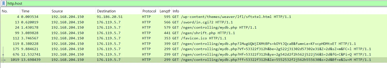 악성 URL을 포함한 HTTP 요청 (GET /ngen/controlling/mydb.php?Vf=...)