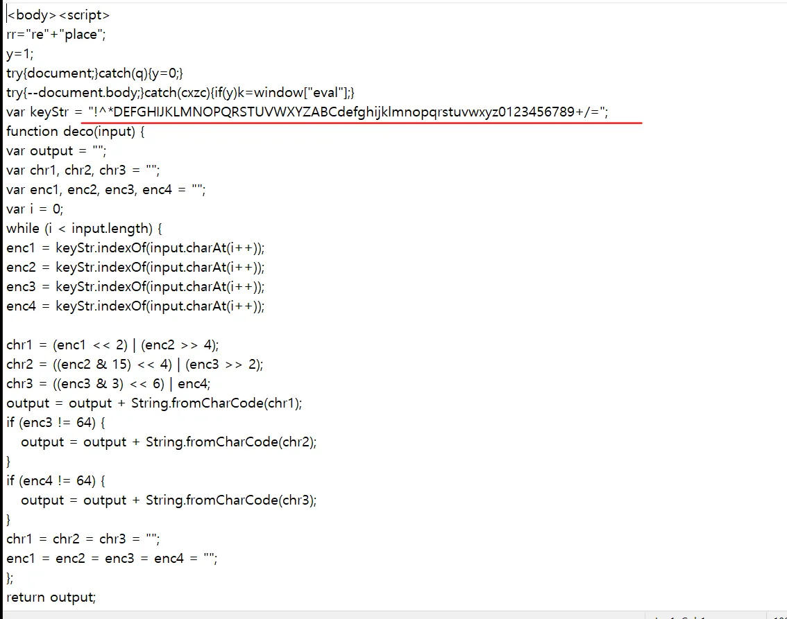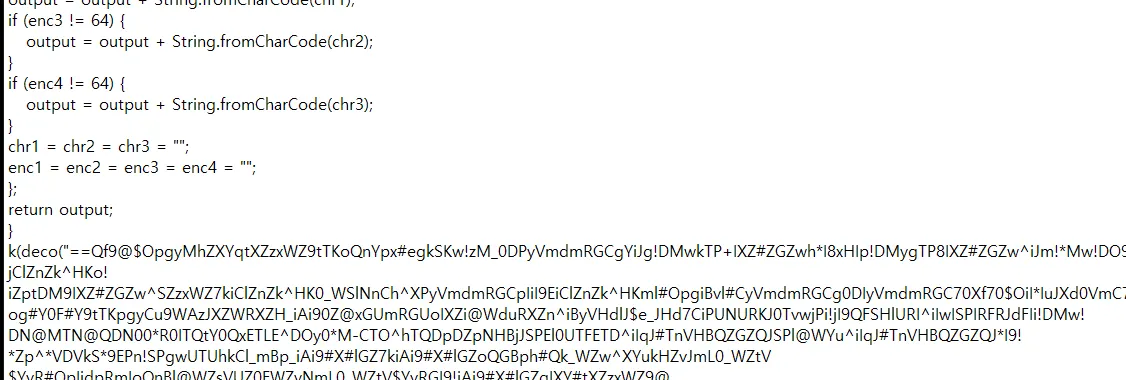 같은 위치에 html 파일이 있어 확인해보니 base64로 인코딩된 문자열을 키를 이용해 디코딩해서 자바스크립트를 실행하는 것도 확인하였다.