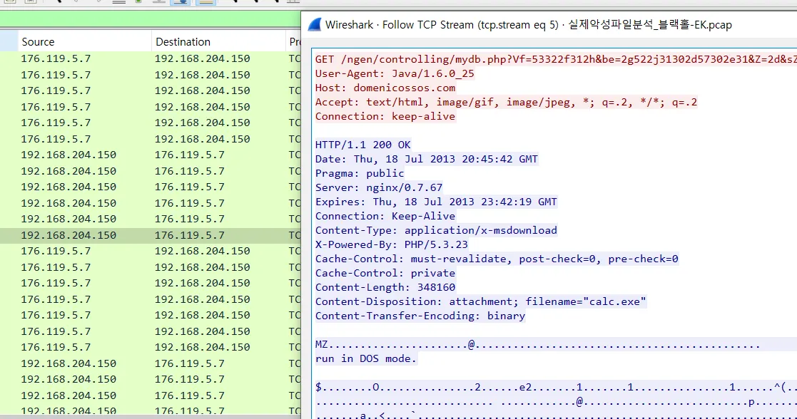 정상적인 웹 서버가 실행 파일을 직접 전송하는 경우는 극히 드물기 때문에 해당 응답을 주는 쪽이 공격자로 판단하였다