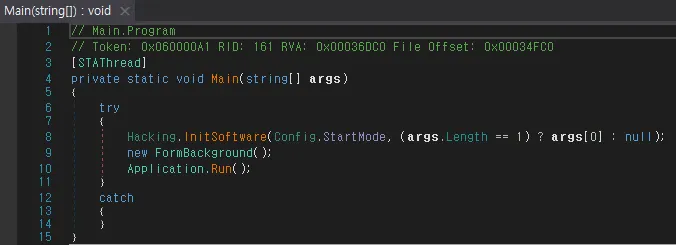 Hacking.initSoftware 메소드 호출 및 FormBackground 폼 생성 확인, 해당 부분에 대한 분석이 필요함