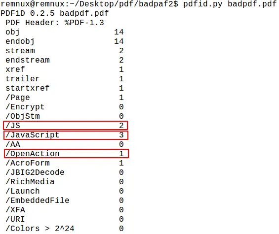 OpenAction 1개, JS 2개, JavaScript 3개 의 의심스러운 키워드를확인