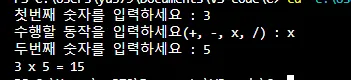printf("수행할 동작을 입력하세요(+, -, x, /) : ");
