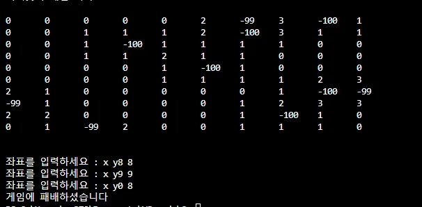 printf("게임에 패배하셨습니다"); // 입력한 좌표가 음수면 패배