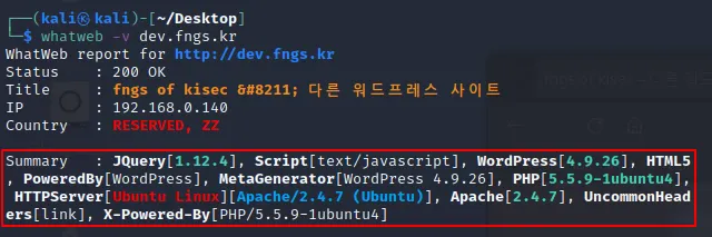 whatweb 도구를 사용하여 해당 도메인의 추가 정보 획득