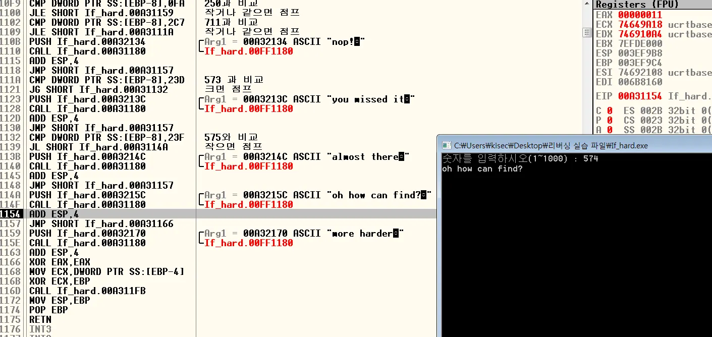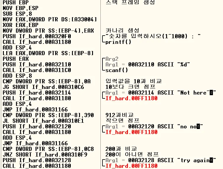 250과 비교하는 부분에서 250보다 크고 711보다 큰 2가지 조건이 모두 참일때 printf()가 출력이 되며 각 조건별로 점프하는 구간이 다르기 때문에 else if 문 안에 if 문을 삽입하여 구현
