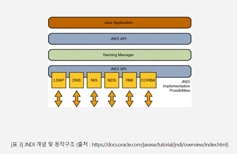 · Java 애플리케이션이 조회를 수행하고 LDAP, RMI, DNS 등과 같은 프로토콜을 사용하여 Java 객체를 검색할 수 있도록 하는 Java API