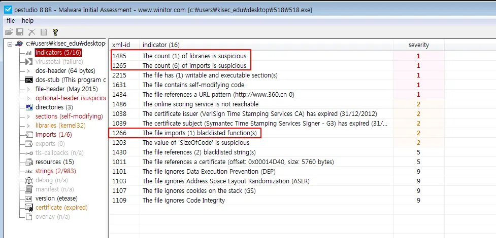 The file imports (7) blacklisted function(s) (1266) : 파일이 7개의 블랙리스트에 올라 있는 함수를 임포트하고 있다는 것을 의미