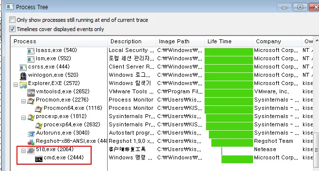 518 하위 프로세스로 cmd 가 실행 중인것을 확인 (518은 종료)