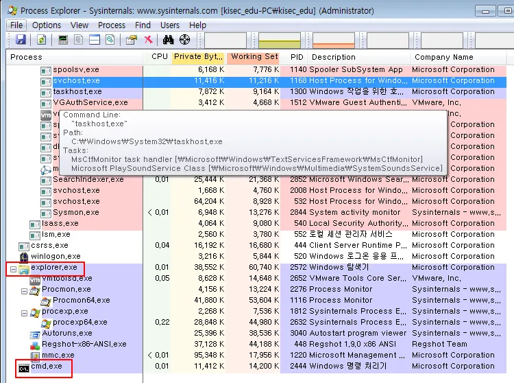 cmd가 독립적으로 실행 중인것 확인 (정상 cmd 의 경우 explore 의 하위 프로세스로 실행 + conhost도 함께 실행) → 이상징후 확인