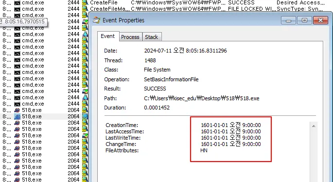 518 실행 후 바로 cmd 가 실행되며 공격자와 통신을 하고 있다는 것을 확인 가능