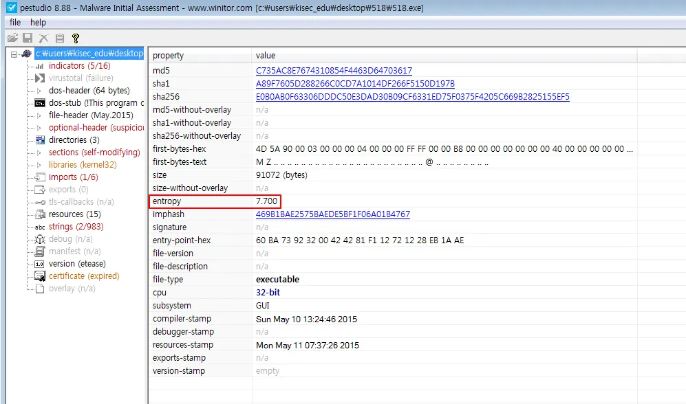 악성코드에서 자주 사용되는 함수들을 import 하고있는 것을 확인