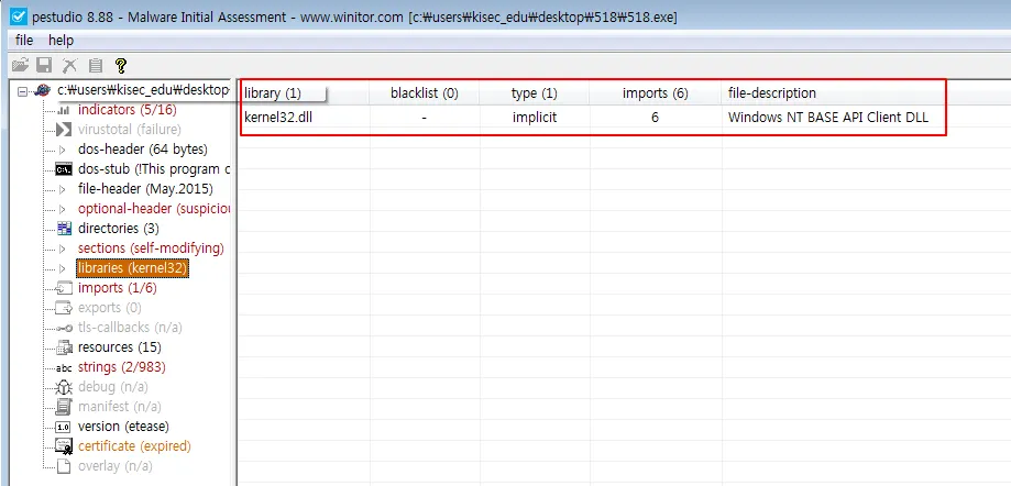 해당 파일이 1개의 dll 만을 사용하고 있는 것 확인, 일반적인 파일은 Ntdll.dll, Kernel32.dll, User32.dll 3개가 같이 사용되는데 1개만 사용 중이므로 의심스러운 정황 포착
